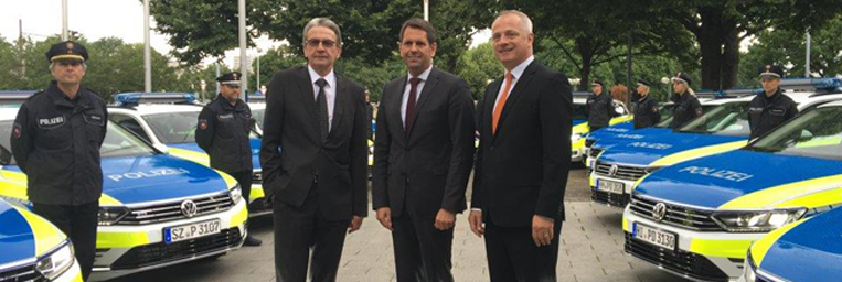30. Juni 2016. Das niedersächsische Wirtschafts- und Verkehrsministerium hat im Rahmen des Schaufensters Elektromobilität weiter die Landespolizei bei Ausbau ihrer Elektrofahrzeug-Flotte unterstützt. Verkehrsminister Olaf Lies hat heute zwölf neue Funkstreifenwagen an Landespolizeipräsident Uwe Binias übergeben. Bei den Fahrzeugen handelt es sich um das Plug-in-Hybrid-Modell VW Passat GTE Variant, das als vollwertiger Funkstreifenwagen einsetzbar ist.
