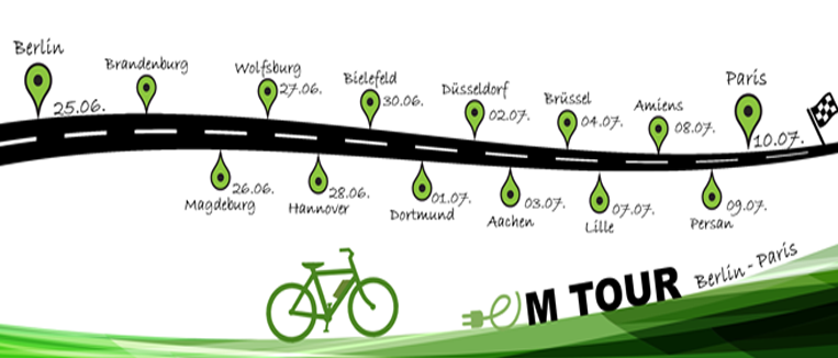 Am Vormittag begann die EM-Tour in Berlin. Thomas Ebbinghaus möchte mit seiner Gruppe in zwei Wochen von Berlin nach Paris radeln — rein elektrisch. Begleitet werden sie hierbei von einem Fahrer im Nissan-Elektroauto. Die Route umfasst mehrere Etappen, ehe sie am 10. Juli zum Finale der EM in Paris eintreffen. Insgesamt umfasst die Strecke rund 1.200 Kilometer, pro Tag sollen 80 bis 120 Kilometer mit dem eBike zurückgelegt werden.