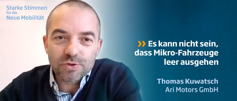 Thomas Kuwatsch, Co-Gründer und Finanz-Geschäftsführer des BEM-Mitgliedsunternehmens ARI Motors, spricht über die Hintergründe der Firmengründung und vermittelt eine positive Sichtweise in Bezug auf die vielfältigen Möglichkeiten der Neuen Mobilität insbesondere im Bereich Leichtfahrzeuge. Im Bereich der fehlenden Bundesförderung sieht er genau so wie der BEM einen Nachholbedarf für diese umweltschonende Fahrzeugkategorie.