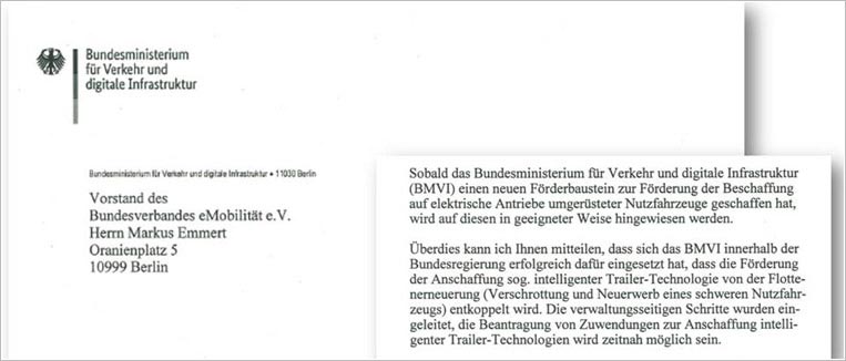 Auf eine erneute Stellungnahme des BEM lenkt das BMVI ein und leitet Korrekturmaßnahmen bestehender Richtlinien ein. So soll auf ein künftiges Förderprogramm für Umbauten hingewiesen werden und intelligente Trailer-Technologie wird entkoppelt und somit gefördert, auch wenn kein Bestandsfahrzeug verschrottet wird.