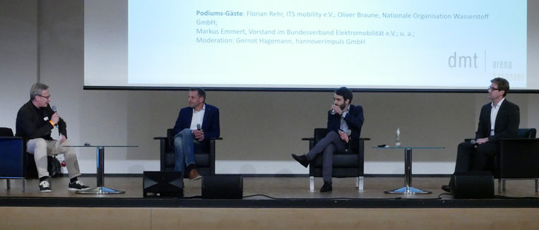 Bestimmt wurde die Podiumsdiskussion zur eMobilität vom Diskurs über die zukünftige Antriebs-Technologie im Auto. Während Oliver Braune von der NOW darauf hinwies, dass sich in Sachen Wasserstoff-Infrastruktur einiges getan habe, konterte BEM-Vorstandsmitglied Markus Emmert, dass die Brennstoffzelle im Pkw keine Zukunft hat und verwies auf die ernormen Kosten für eine Wasserstoff-Tankstelle, den viel zu hohen Primärenergieeinsatz, sowie die langen Pausen zwischen den Tankvorgängen. »Wir müssen uns verstärkt der batterieelektrischen Technologie im Bereich der Individualmobilität zuwenden«.
