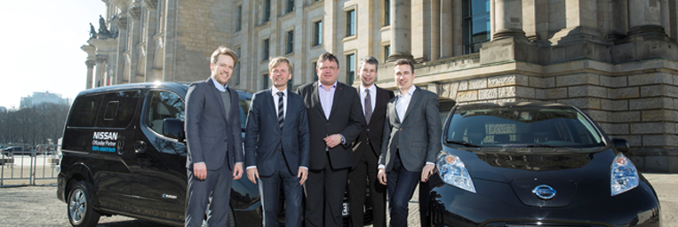 Drei Tage lang kann sich der Deutsche Bun­destag über all­t­agstaugliche Konzepte zur Elek­tro­mo­bil­ität informieren und eAu­tos der Kom­pak­tk­lasse sowie Klein-Liefer­wa­gen testen. Das BEM-Mit­glied­sun­ternehmen NISSAN stellt dafür Fahrzeuge der Typen »Leaf« und »e‑NV 200« zur Ver­fü­gung. Organ­isiert wird die Infor­ma­tionsver­anstal­tung vom Par­la­mentskreis Elektromobilität.