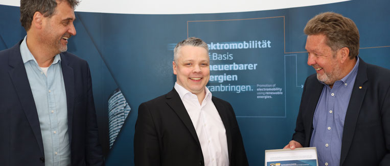 »Ich freue mich über die Berufung zum BEM-Landesvertreter für die Hansestadt Bremen«, so Jens Schabacher bei der offiziellen Urkundenübergabe mit Frank Müller und Kurt Sigl im Kontext der BEM-Pressekonferenz in Berlin im Mai 2021. Jens steht seit vielen Jahren im stetigen Austausch mit dem BEM und engagiert sich kontinuierlich in den BEM-Arbeitsgruppen Ladeinfrastruktur, PR- & Öffentlichkeitsarbeit und Maritime Elektromobilität. »Gemeinsam mit den nordischen Stützpunkten werden wir die Neue Mobilität in der politischen und medialen Öffentlichkeit verankern und den Austausch mit unseren innovativen regionalen Unternehmen im Norden weiter ausbauen.«