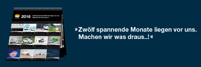 Herzlichen Dank an alle Monatspaten, die den Kalender ermöglicht haben: CYMAGE MEDIA, promoter Gesellschaft für Absatzförderung, Nissan, ebee smart technologies, bike-energy, E‑Mobilität von Amsterdam nach Berlin, ePlanB, Mitsubishi greenmobility, ComBInation, Röchling Automotive und BOOKANDPLAY.