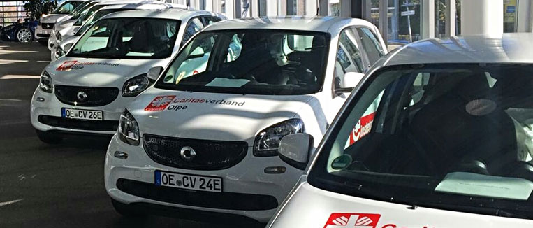 Dortmund / Berlin, 29.10.2019. Mit 165 eAutos vom Typ Smart wird die Caritas in Nordrhein-Westfalen Deutschlands größte Elektroflotte im Bereich Pflege & Soziales in Betrieb nehmen. Am Dienstag übergab Wirtschaftsminister Andreas Pinkwart die vom Land geförderten Fahrzeuge an den Wohlfahrtsverband. 25 Ortsverbände werden die Kleinfahrzeug vorrangig für die ambulante Pflege nutzen und damit ca. 3.000 Patienten mit modernen Elektrofahrzeugen erreichen. Pro Jahr können somit fast zwei Millionen Kilometer klimafreundlich gefahren und schädliche Emissionen vermieden werden.