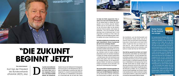 In der Welt-Beilage zum Thema Dekarbonisierung von Industrie, Städten und Gesellschaft beschreibt der BEM für die alternativen Antriebe die Wichtigkeit, Verkehr und Energie als Netz zu betrachten. »Es ist weniger wichtig, welches Endgerät wir nutzen. Klar, unsere neuen Fahrzeuge sollen tadellos funktionieren und je nach Komforterwartung auch noch weitere Bequemlichkeiten vorhalten. Aber im Vordergrund steht der Zugriff auf das Ladenetz, die Stromversorgung und die Mobilitätsregulierung für fließenden Verkehr«, so BEM-Präsident Kurt Sigl.