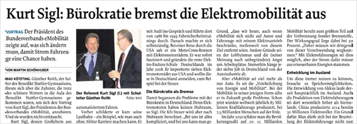 BEM-Präsident Kurt Sigl erklärte auf dem eMobilitätstag in Bad Kötzting anschaulich und am eigenen Beispiel, wie Bürokratie die Elektromobilität ausgebremst hat und dass wir bei dem Thema leider immer noch auf dem Bremspedal stehen. Der Lobbyismus und die Angst vor Arbeitsplatzverlusten tragen ebenfalls dazu bei, dass Deutschland bisher nicht ansatzweise das anvisierte Ziel erreicht hat.