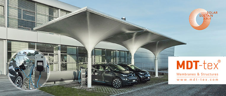 Optimiert jeden eMobilitäts-Parkplatz: Das BEM-Mitgliedsunternehmen MDT-tex liefert und fertigt weltweit innovative und sturmsichere Sonnenschirme, Sonnenschutzsysteme und textile Architektur mit nachhaltiger Energiegewinnung. Zur Auswahl steht hier der Solarschirm in verschiedenen Modellen und das Solar Car Port.