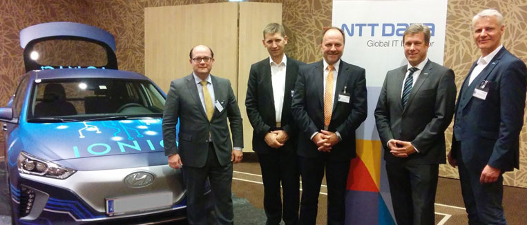 So vermittelte Olaf Mußhoff, Leiter der Automechanika Frankfurt, interessante Hintergründe zum Ausstellungskonzept von »Tomorrow´s Service & Mobility«. Andreas Pfeffer, Geschäftsführer von emovum, zündete ein emotionales Motivations-Feuerwerk zur Elektromobilität und Dr. Michael Spreng, Head of i‑Mobility der NTT DATA Deutschland, hielt eine Rede zum Thema »Intelligente Plattformen für den Mobilitätswandel«. Elektromobilität bedeutet für NTT DATA dabei mehr als nur einen Austausch von konventionell angetriebenen Fahrzeugen durch Elektroautos — Städte werden zu »Smart Cities«: Es geht um einen Wandel der Mobilität hin zu intermodalen Verkehrskonzepten — der intelligenten Mobilität.