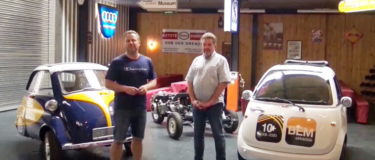 Andreas Muntinga vom BEM-Mitgliedsunternehmen SolarAllianz Network SAN im Talk mit BEM-Präsident Kurt Sigl und seinem Microlino, dem ersten Vorserienfahrzeug in Deutschland.