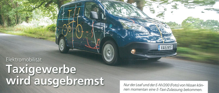 Aufgrund einer neuen Eichverordnung für Taxameter können seit Ende 2016 bundesweit keine Modelle mehr als Taxi zugelassen werden, die nicht vom Hersteller selbst als Taxi angeboten werden. Damit fallen derzeit bis auf den Leaf und den e‑NV200 von Nissan alle Elektrofahrzeuge aus dem Angebot.