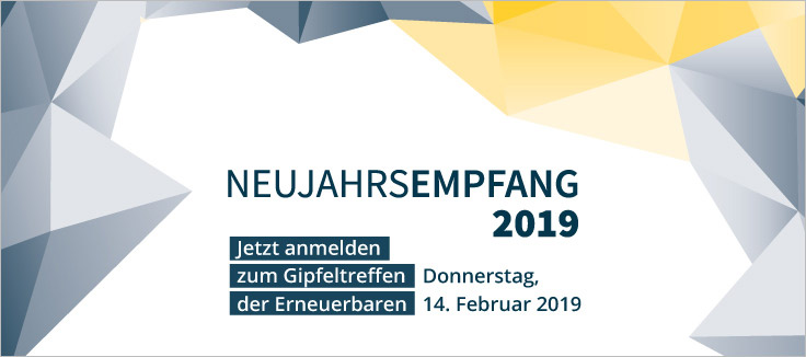 Am 14. Februar 2019 empfängt der Bundesverband Erneuerbare Energie gemeinsam mit seinen Mitgliedern u.a. dem BEM erneut rund 1.400 Gäste aus Politik, Wirtschaft und Gesellschaft. Stimmen Sie sich mit uns auf das energiepolitische Jahr 2019 ein und pflegen Sie Ihr Netzwerk in der Erneuerbaren-Branche.